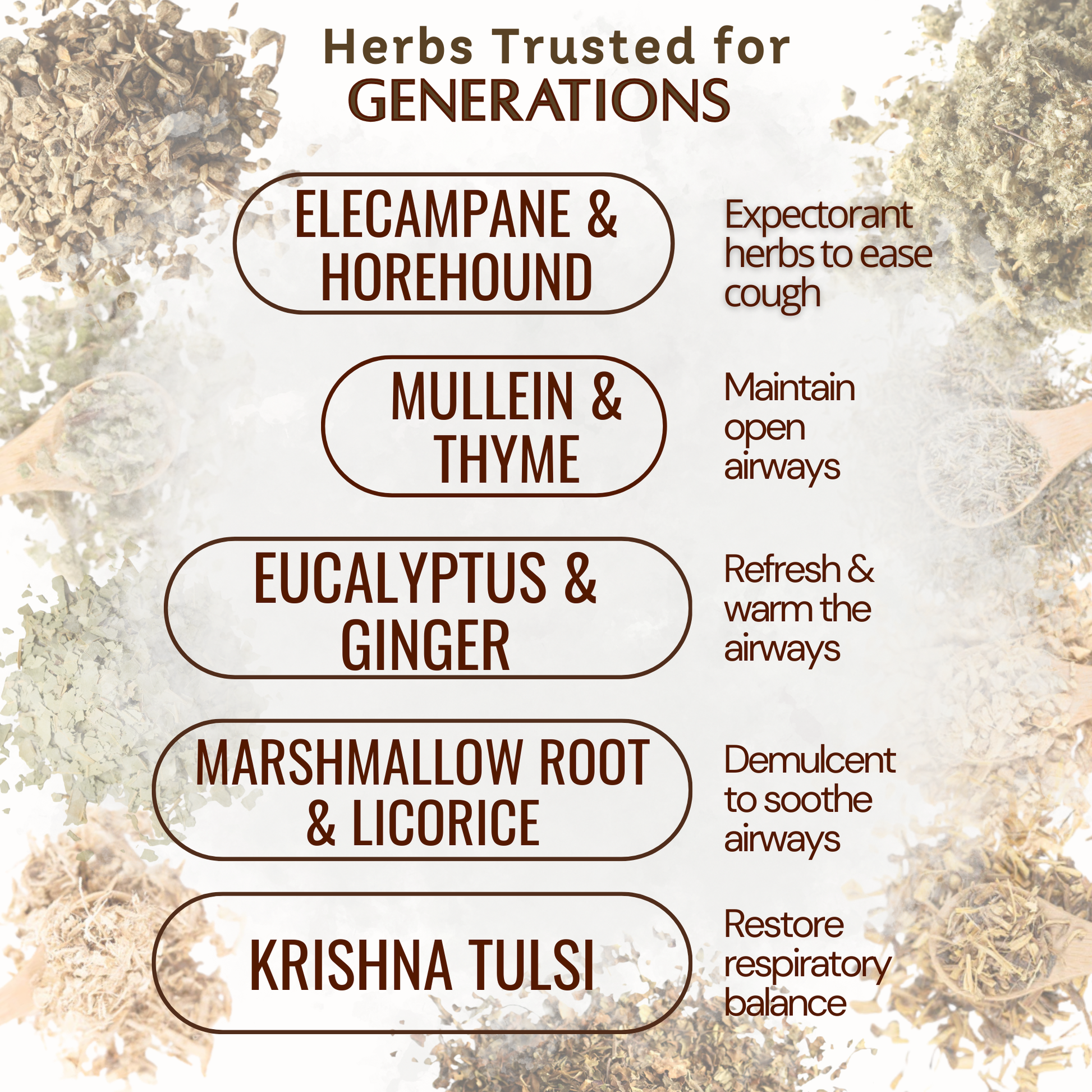 100% Organic ingredients: Elecampane Root, Horehound Leaf, Krishna Tulsi, Marshmallow Root, Mullein Leaf, Licorice Root, Ginger Root, Eucalyptus Leaf, Thyme Leaf.