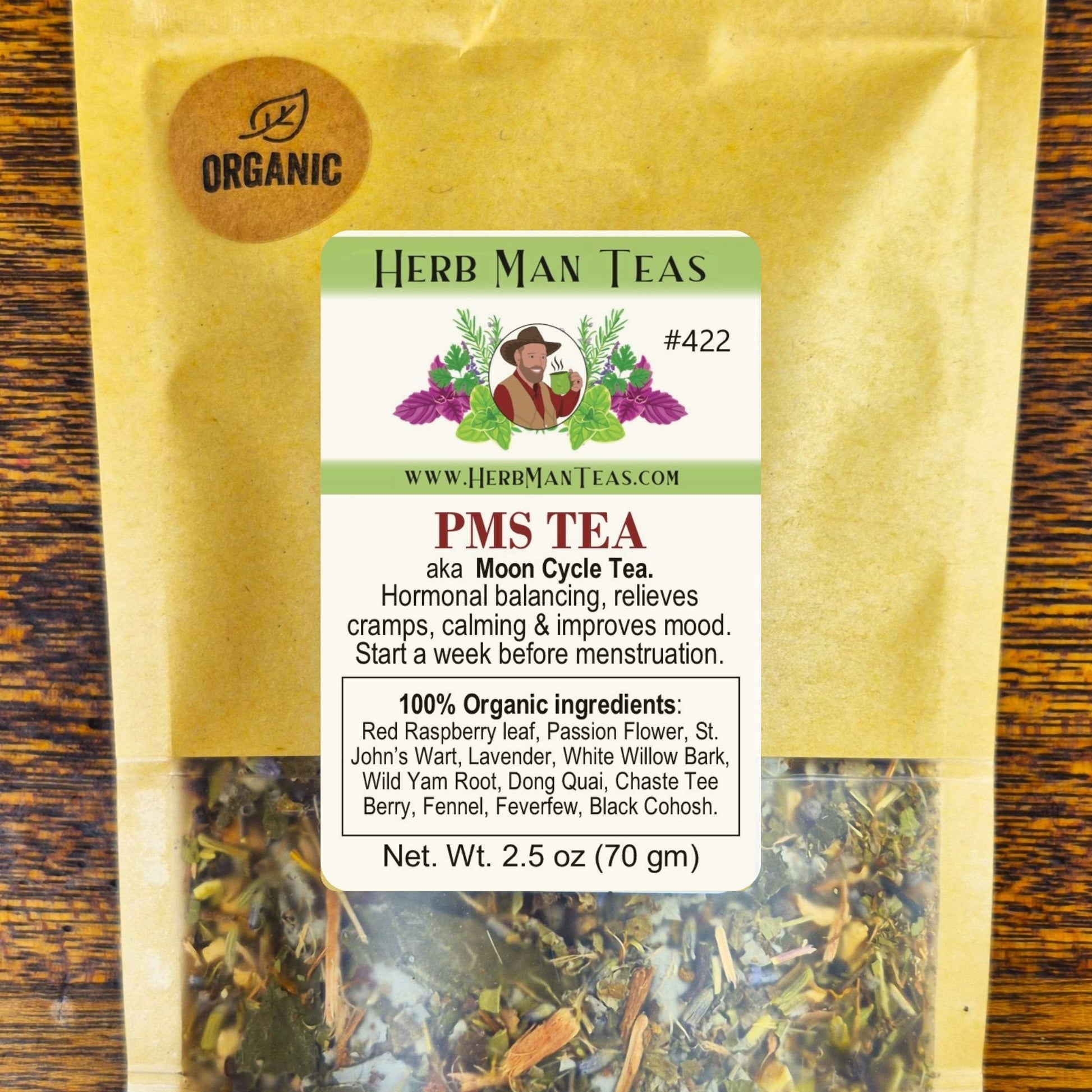 Organic: Red Raspberry Leaf, Wild Yam Root, Dong Quai, Chaste Tree Berry (Vitex), Black Cohosh, Feverfew, White Willow Bark, Passion Flower, St. John’s Wort, Lavender, Fennel Seed.